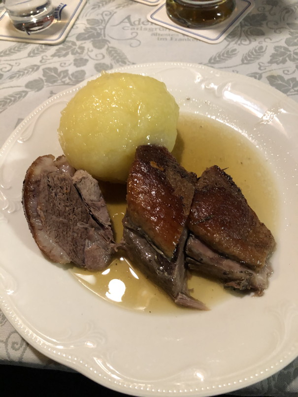Gansbrust mit Klößen und Sauer-/Rotkraut.