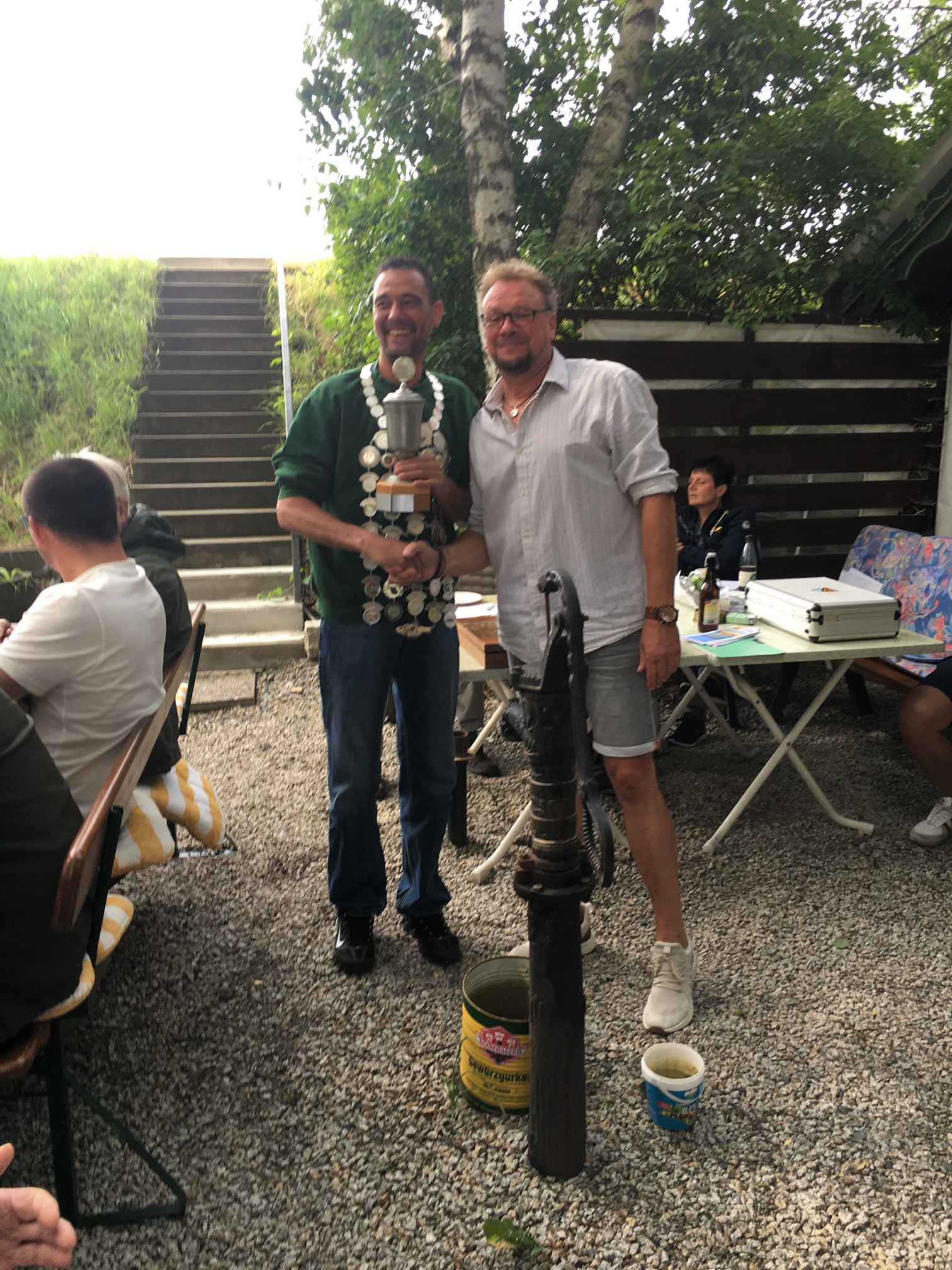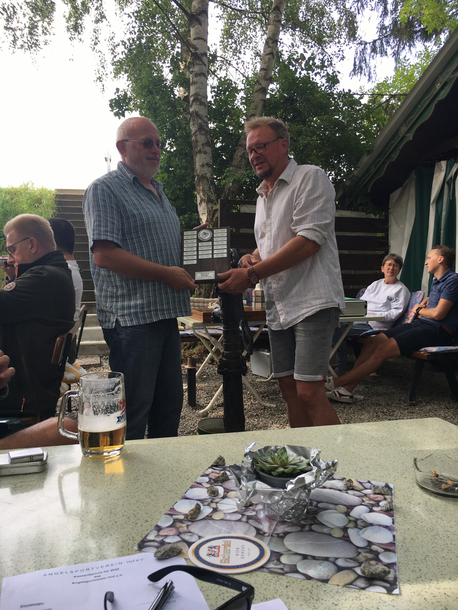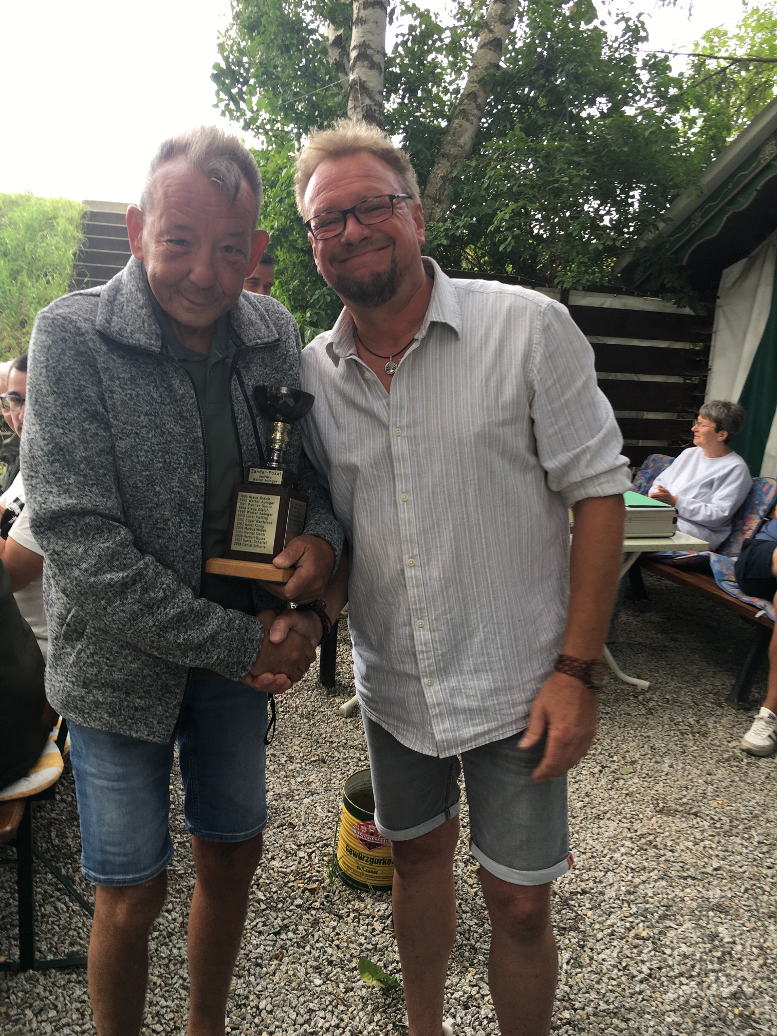 Uwe Lottes (linkes Bild) erhält den Pokal für den schwersten Fisch